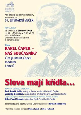 Tomáš Halík bude ve čtvrtek 12. července 2018 hostem 57. literárního večeru z cyklu "Slova mají křídla", tentokráte na téma: Karel Čapek - náš současník? Čím je literát Čapek moderní i dnes? [f]